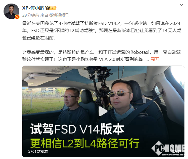 12月30日消息,小鹏汽车董事长何小鹏今日在微博发布自己近期在美国花4小时试驾特斯拉FSD V14.2的视频,并大胆预测2026年将实现下一代真正的全自动驾驶,直接从L2跃升至L4级别,跳过L3阶段。