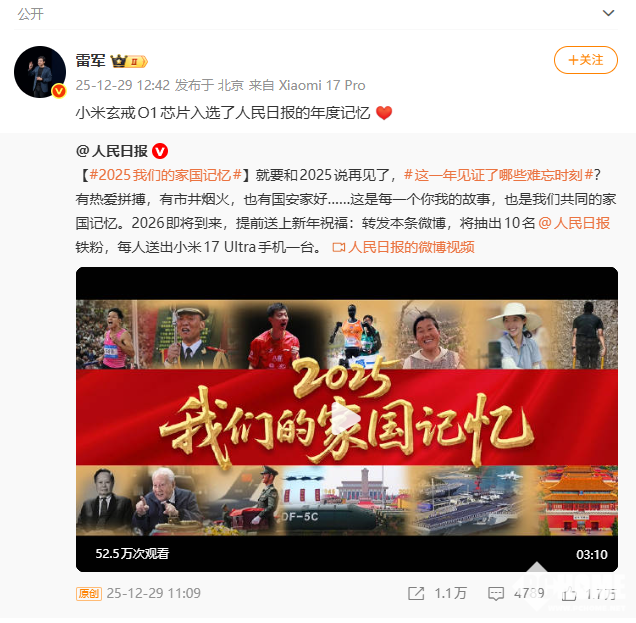 2025年12月30日消息,小米董事长兼CEO雷军昨日发布微博,小米玄戒O1芯片入选了人民日报的年度记忆。