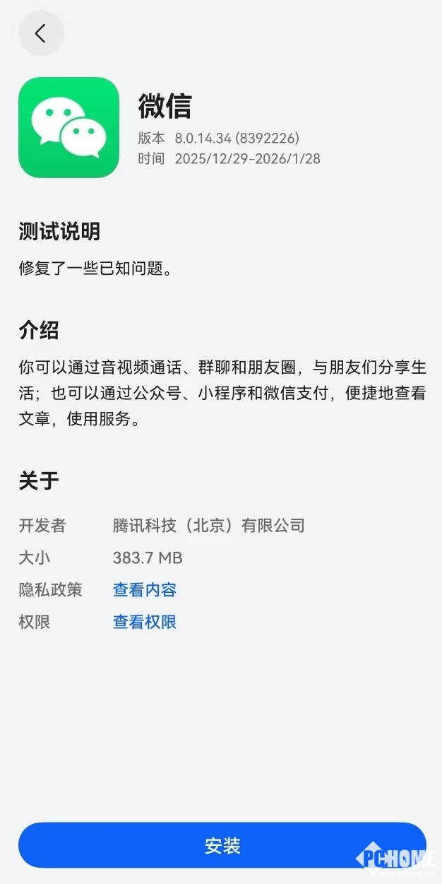 微信鸿蒙版App于12月29日在华为应用市场发布了8.0.14.34版本尝鲜升级,测试时间为2025年12月29日-2026年1月28日。