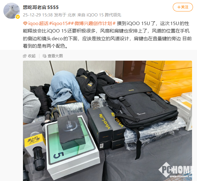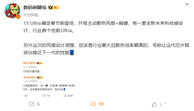 数码大V博主@数码闲聊站今日下午发文表示,iQOO 15 Ultra确定将于春节前发布,升级搭载主动散热风扇以及物理肩键,且有一套全新未来科技感设计,将成为行业首个性能Ultra。