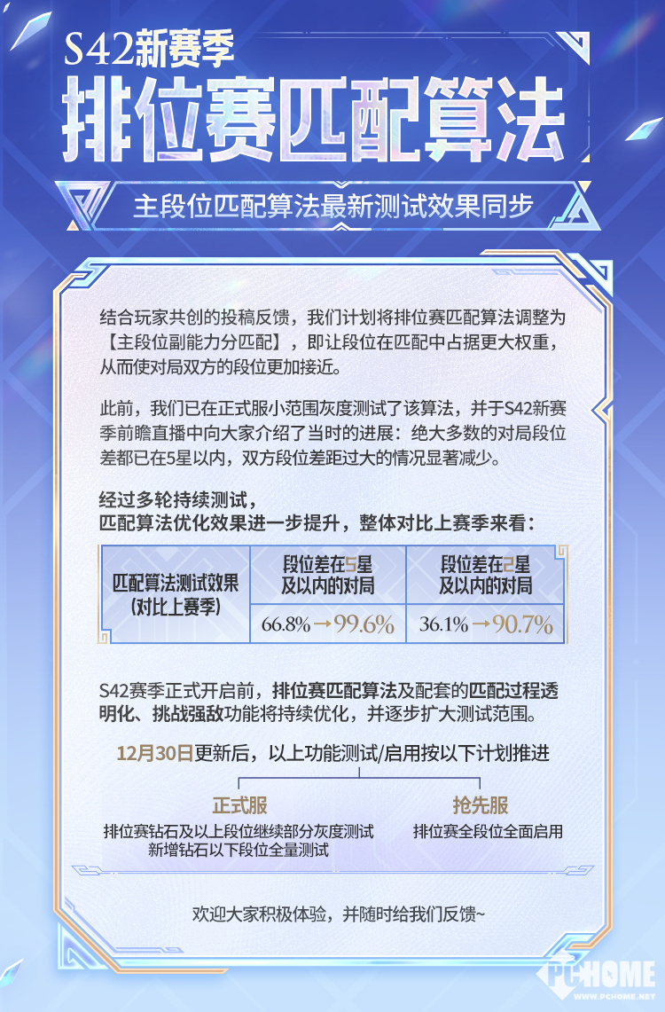 同时,2025年12月30日更新后,抢先服全段位启用新算法,而正式服是钻石及以上段位继续部分灰度测试,钻石以下段位新增全量测试,官方将根据测试数据稳定性逐步扩大范围,希望玩家积极体验并反馈。