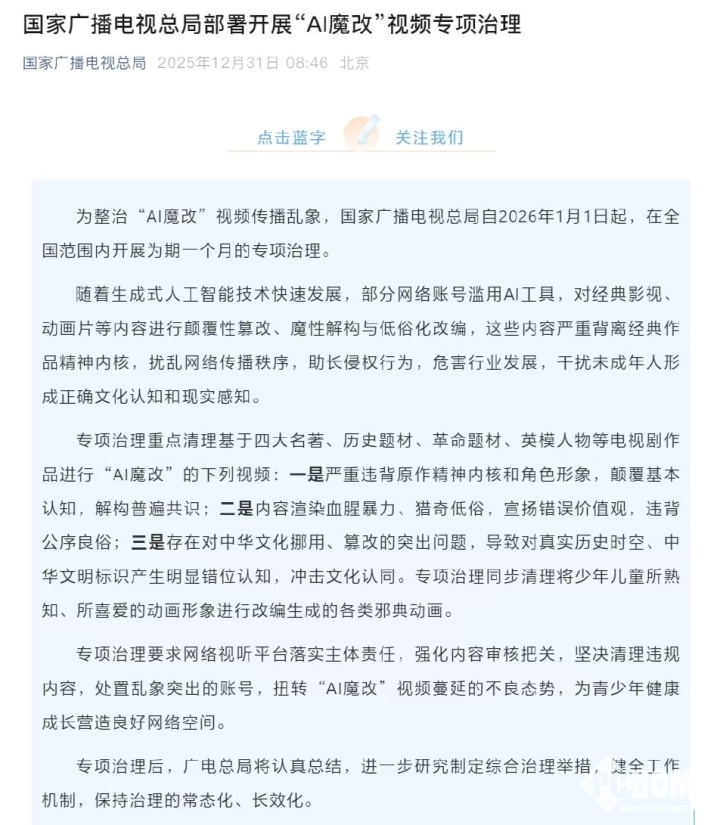 2025年12月31日,国家广播电视总局宣布,为整治“AI魔改”视频传播乱象,自2026年1月1日起,将在全国范围内部署开展为期一个月的“AI魔改”视频专项治理。重点清理基于四大名著、历史题材、革命题材、英模人物等电视剧作品进行“AI魔改”的视频,同步整治涉及未成年人的邪典动画改编乱象。