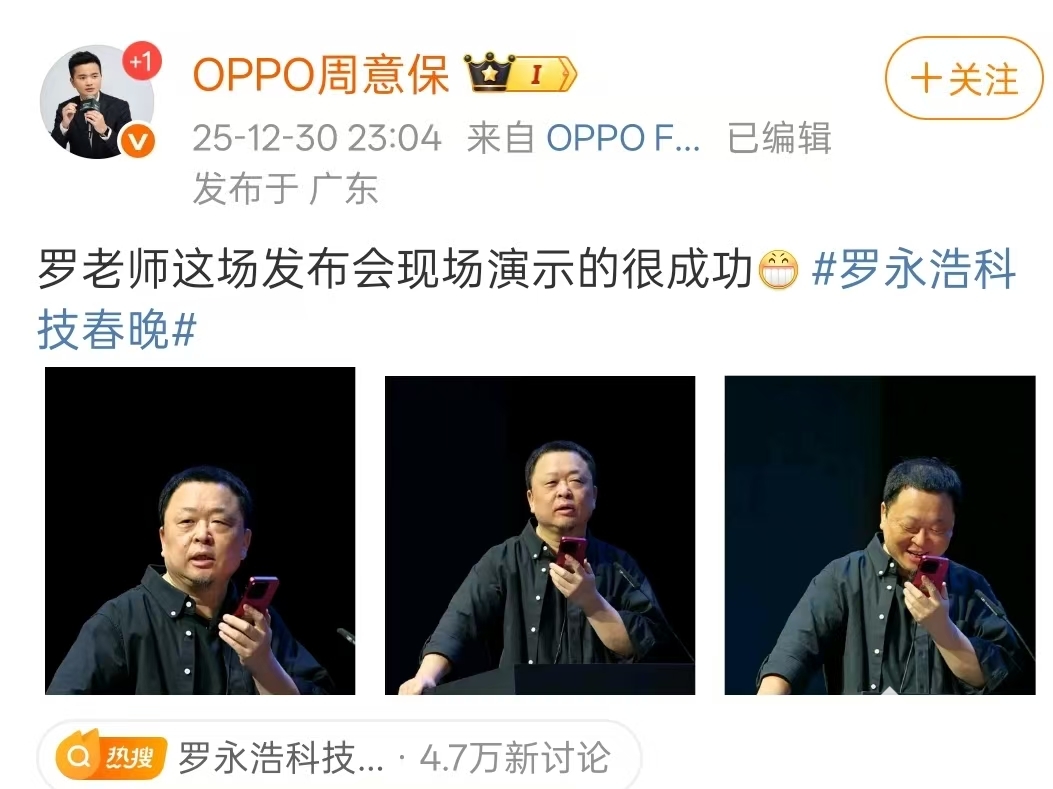 2025年12月30日,阔别七年重启的“罗永浩的十字路口”年度科技创新分享大会在上海西岸国际会展中心举办。在这场吸引200万网友蹲守的“科技春晚”上,罗永浩毫不吝啬地为OPPO旗舰手机点赞。