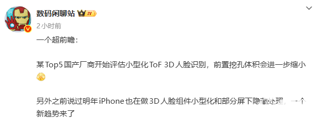 12月31日消息,数码大V博主@数码闲聊站今日发布博文称,国内某厂商开始评估小型化ToF 3D人脸识别,前置挖孔体积会进一步缩小。结合此前爆料明年iPhone也在做3D人脸组件小型化和部分屏下隐藏处理,预测手机界将迎来一个新趋势。