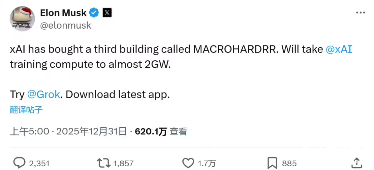 12月31日消息,埃隆·马斯克旗下人工智能公司xAI今日宣布,已正式收购第三幢名为“MACROHARDRR”的大型建筑作为xAI的新数据中心,标志着其“Colossus”超算集群进入新一轮扩张阶段。据内部文件披露,此次扩建将使xAI整体训练算力所需的电力容量提升至近2吉瓦(GW),相当于一座中型核电站的输出功率。马斯克在社交平台X上表示:“为支撑Grok-4及未来通用人工智能(AGI)的研发,我们必须拥有全球最强大的训练基础设施。”据悉,新购建筑将主要用于部署新一代GPU集群,预计新增数万张NVIDIA GB200 Superchip,并配套建设专用冷却与供电系统。
