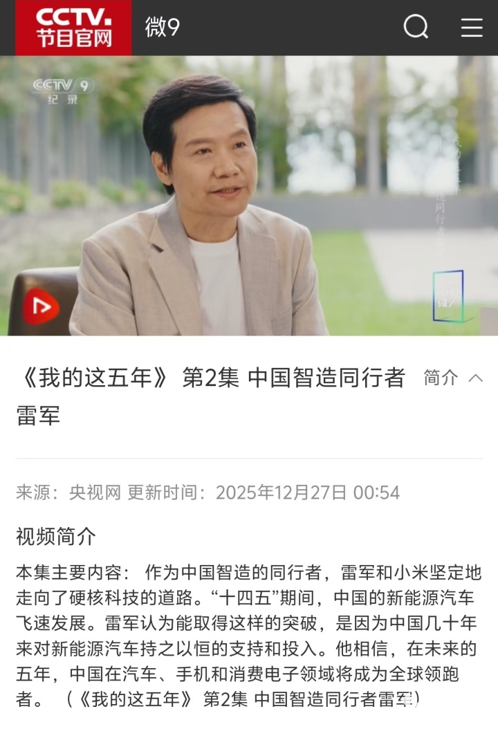 央视通过专题纪录片回顾小米科技创始人雷军的创业历程,重点突出了小米“死磕技术”的发展路径,小米前三季度研发投入235亿元,高端手机市占率升至16.8%,带动了200余家供应链企业发展,精准契合“科技自立自强”国家战略,为民营经济高质量发展提供了可借鉴的实践样本。