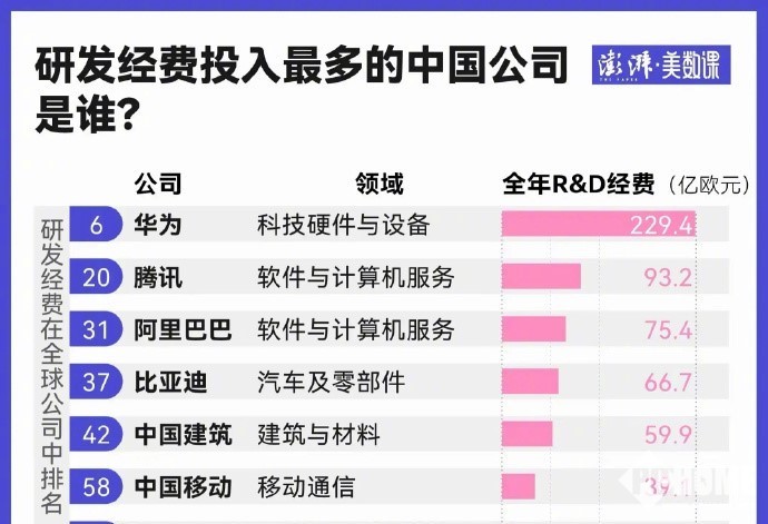 12月31日消息,根据欧盟委员会最新发布的《2025年欧盟工业研发投资记分牌》(EU Industrial R&D Investment Scoreboard)显示,全球企业研发经费投入排名中,华为以229.4亿欧元位列全球第六,成为唯一进入全球前十的中国企业。腾讯(93.2亿欧元)、比亚迪(66.7亿欧元)和小米(30.4亿欧元)分别位列全球第20、37和77位。