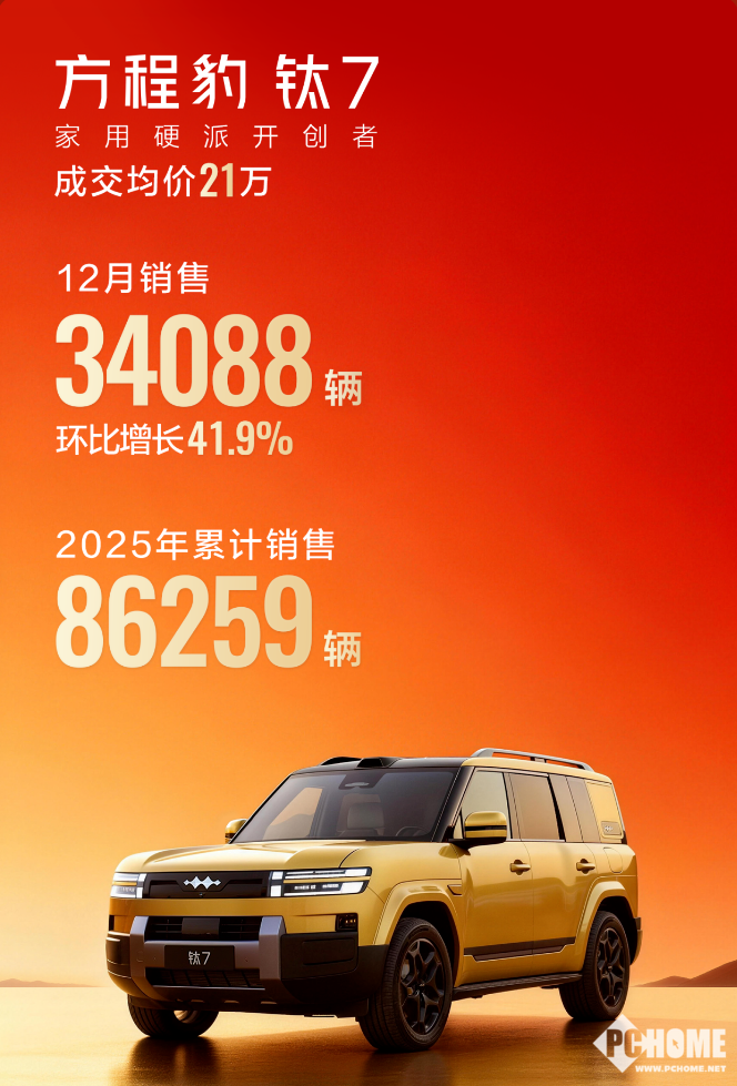据了解,方程豹汽车12月销售50868辆,环比增长36%,同比增长345.5%,2025全年销售234637辆,品牌累销296737辆,成交均价23.4万,成为方程豹新势力品牌增速第一。主力车型钛7贡献最大,单月销量34088辆,环比增41.9%,占品牌总销量67%,并且钛7上市80天销量破5万辆,成为年度现象级爆款。成为“混动SUV”和“方盒子车型”双料冠军。