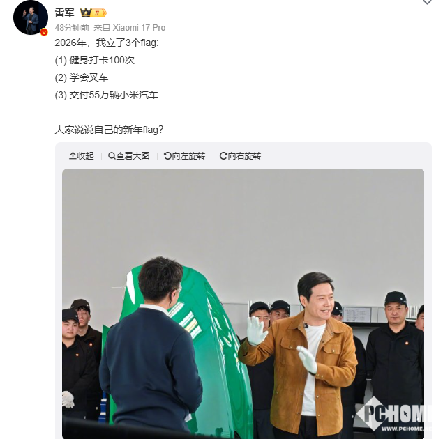 2026年1月4日消息,小米集团创始人、董事长雷军在社交媒体公布2026年flag(新年目标):第一,完成健身打卡100次,第二,学会叉车,第三,小米汽车交付55万辆。