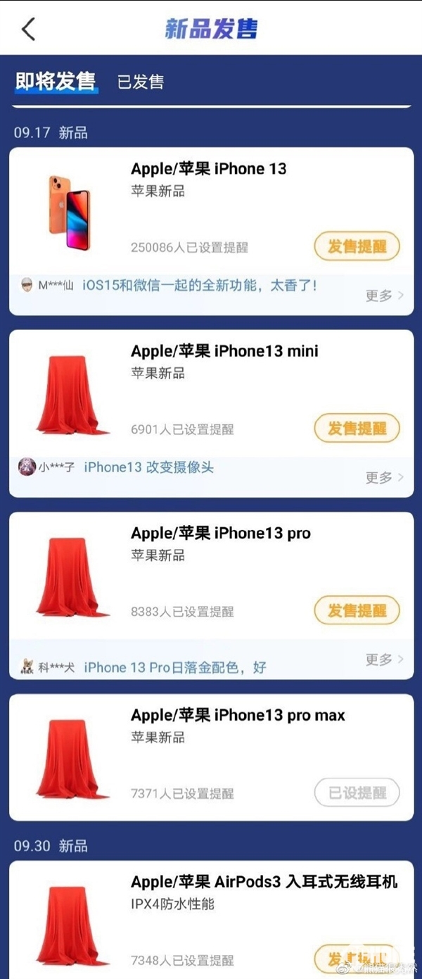 此前有爆料称,苹果iphone 13系列将于9月17日正式发布,但官方并未对此做出回应。今天上午,有博主曝光了电商平台的iPhone 13页面,其中显示iPhone 13系列依旧包括四款机型,而且将会在9月17日正式发售,而AirPods 3入耳式无限耳机将于9月30日开售。