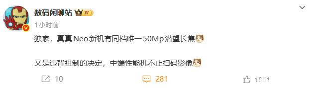 数码大V博主@数码闲聊站今日微博发文表示,真我Neo新机将搭载同档唯一的50MP潜望长焦镜头,影像配置在同级别机型中具有明显优势。
