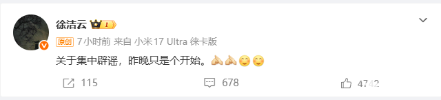 2026年1月4日,小米新任公关部总经理徐洁云发文表示:关于集中辟谣,昨晚只是个开始。