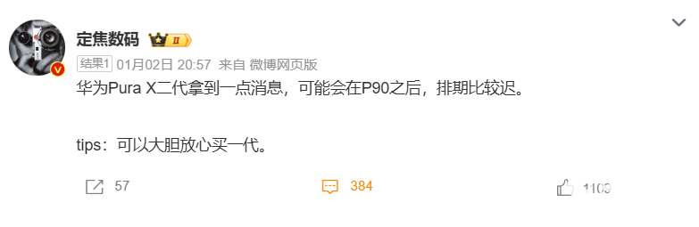 1月4日消息,近期,数码博主@定焦数码微博发文表示,华为旗下阔折叠屏手机迭代产品Pura X2的发布时间将晚于直屏旗舰Pura 90系列。此前已有爆料称其将于2026年3月首发,但最新消息显示,Pura X2排期较Pura 90系列延后,有望于2026年第二季度发布。