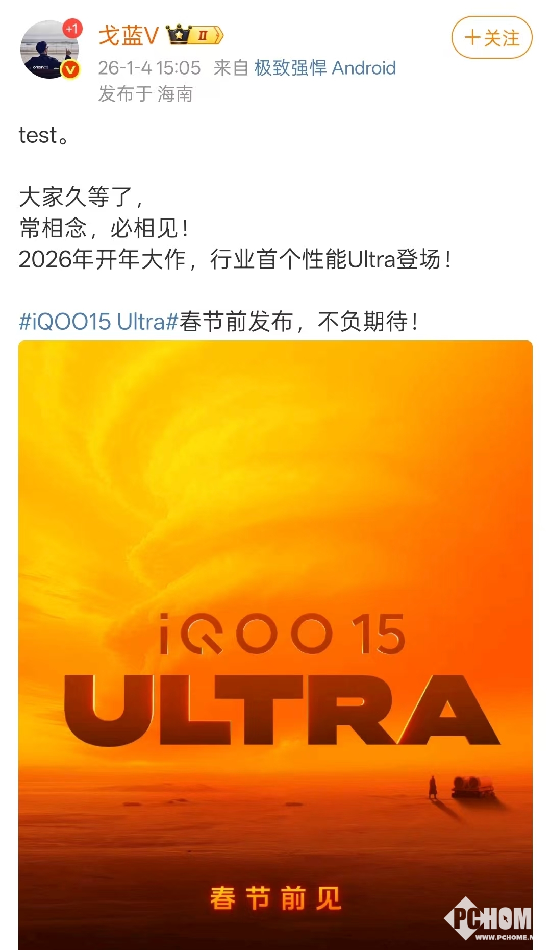 2026年1月4日消息,iQOO 产品经理今日官宣品牌首款Ultra旗舰机型——iQOO 15 Ultra将于春节前首发,定位“行业首个性能Ultra”,超频双芯、主动散热系统与超大容量电池成为核心亮点。