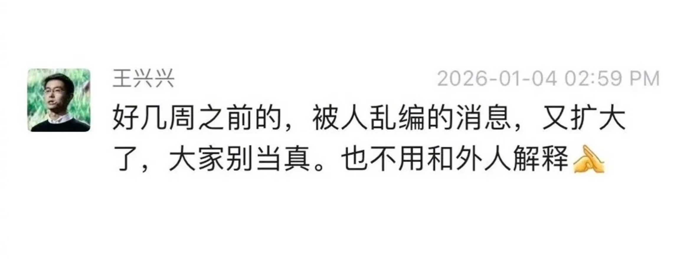 针对上述传闻,2026年1月4日,宇树科技创始人王兴兴在社交媒体平台称,“好几周前被人乱编的消息再次扩大”,呼吁公众“别当真,无需对外解释”。