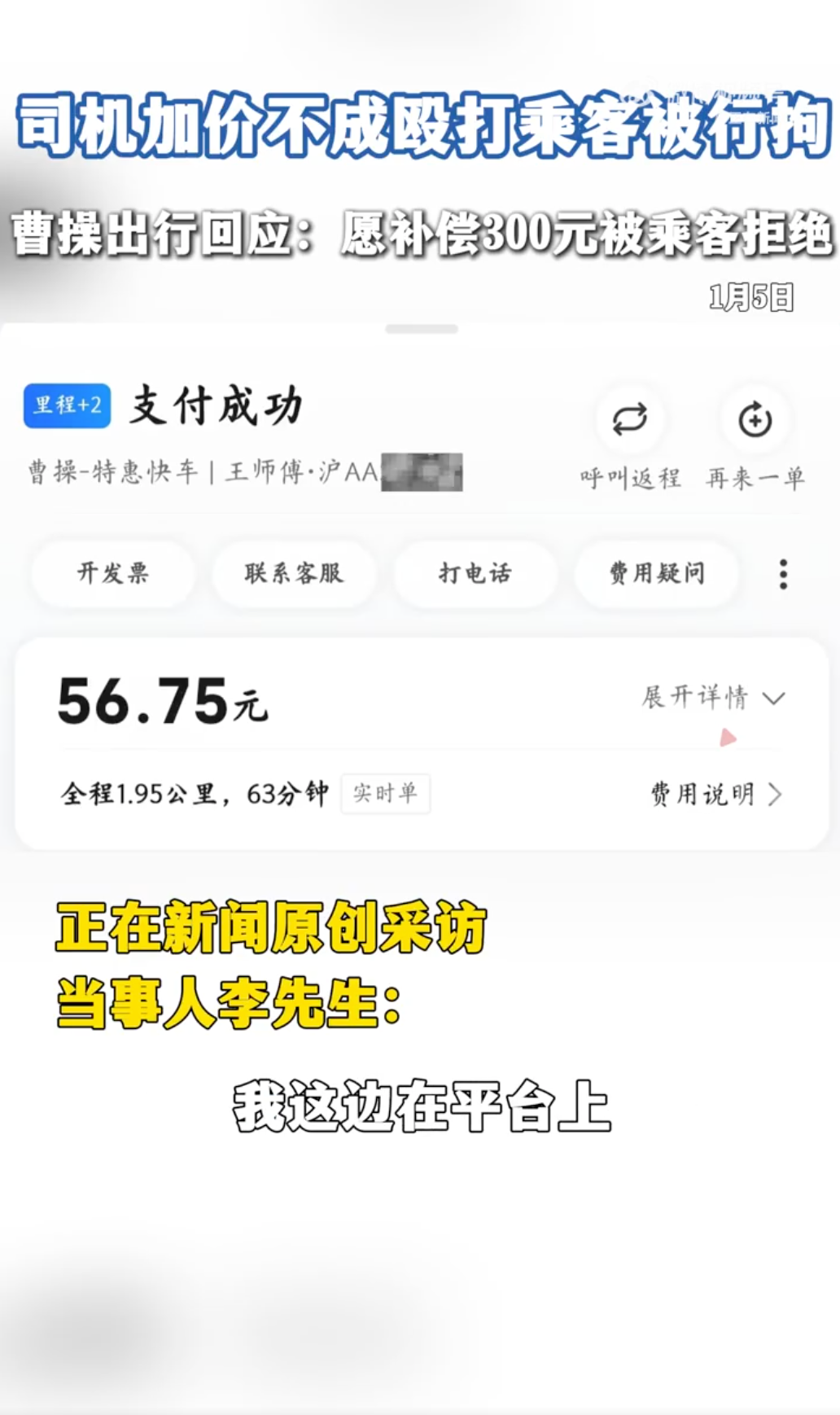 2026年1月5日,《正在新闻》报道称,上海乘客李先生于2025年11月乘坐曹操出行网约车时,遭遇司机加价不成后暴力殴打,后续客服补偿有限的问题。