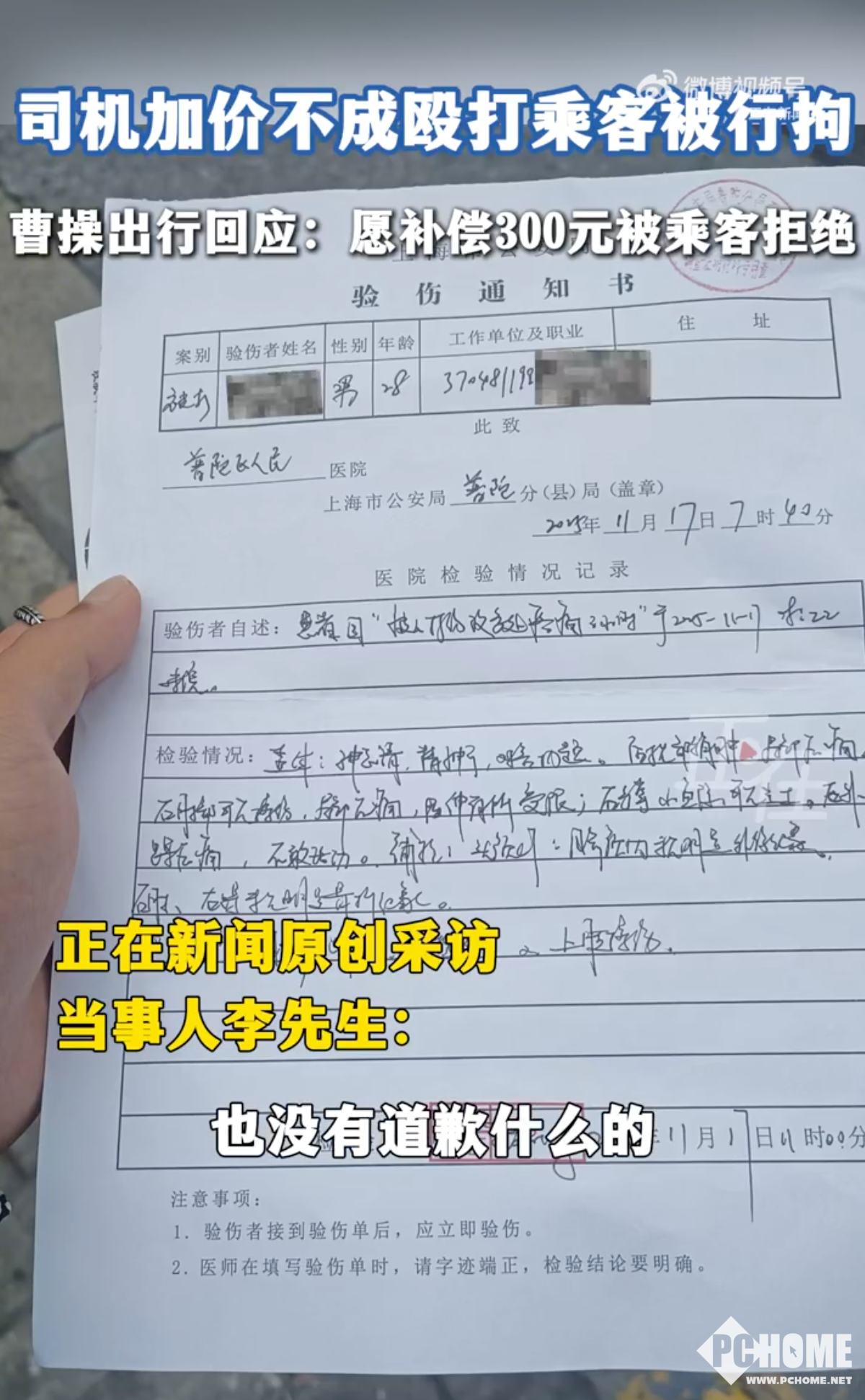 据李先生描述,当时他支付56.75元下单曹操出行网约车,行程中司机以“路程太远、系统计价低”为由要求额外加价,遭拒后司机将车停在路边,强行将他拖出车厢殴打。经医院诊断,李先生多处挫伤、上肢擦伤,警方随后以“故意伤害”对司机处以行政拘留3日。事发后,李先生多次联系曹操出行平台,对方以“需等待执法部门责任认定书”为由拖延处理。
