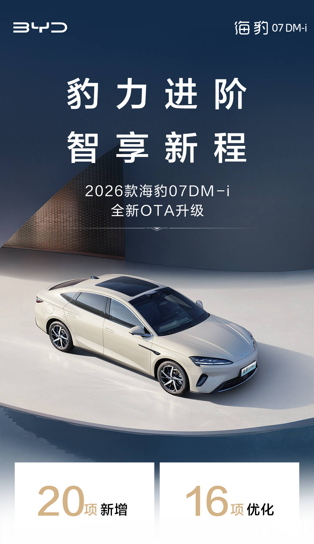 2026年1月6日,比亚迪汽车官方账号昨日发布消息,2026款海豹07DM-i首次OTA升级,涵盖20项新增与16项优化。