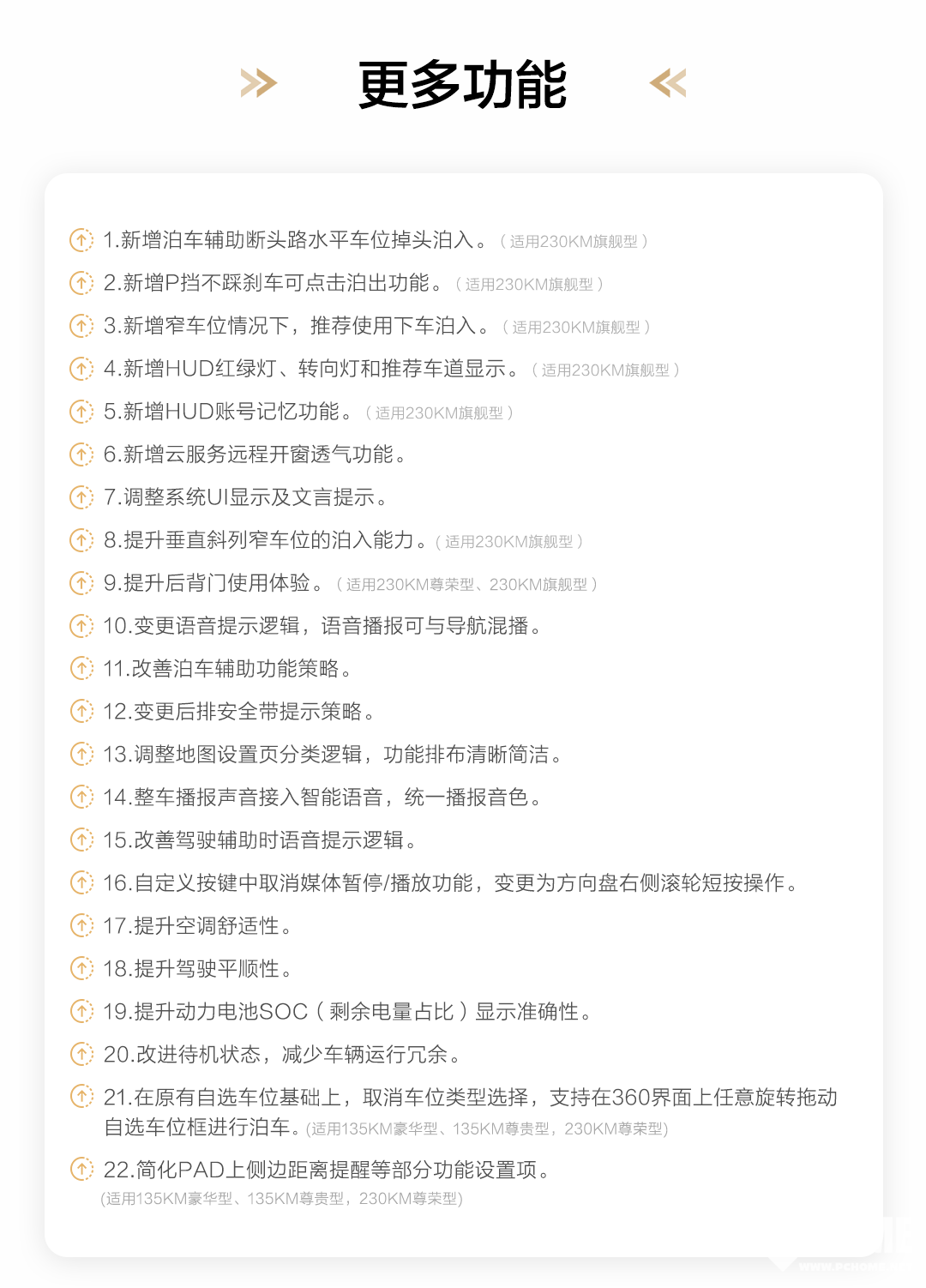 值得注意的是,此次更新部分功能有车型限制,例如智能防晕车功能目前仅适用1.5T 135KM尊贵型,用户需升级后根据车型查看相关功能与优化。