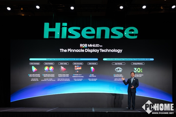 据介绍,新一代RGB-Mini LED技术在红绿蓝三原色发光芯片的基础上,引入第四种天青色自发光芯片。色域值实现从100% BT.2020提升到 110% BT.2020;色彩体积达到100%;色准实现高亮下色彩也可以更纯正,低亮不失真;还降低有害蓝光60%以上。此外海信自研的信芯AI画质芯片H7也进行了性能升级,控色精度达到了134bits,实现真正的全局高色域、全亮度高色域。