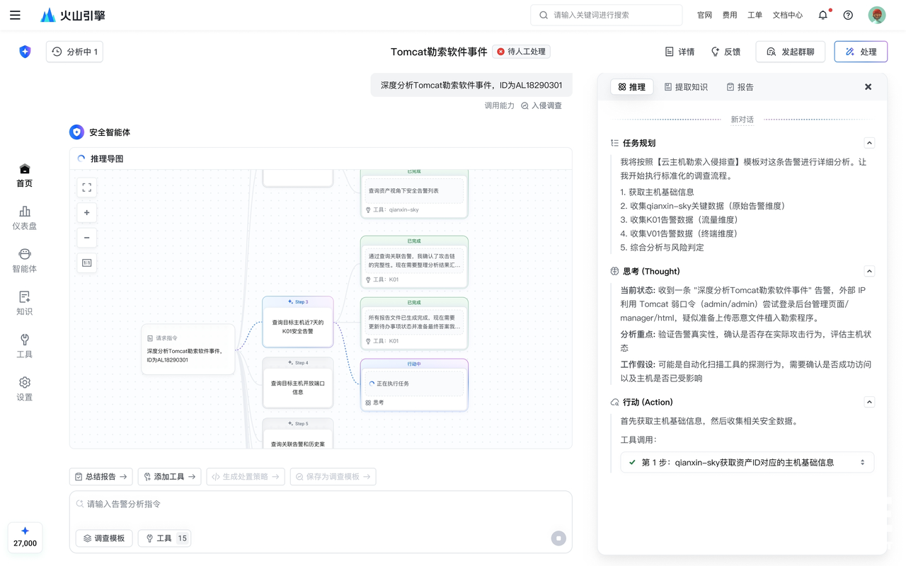 同时,火山引擎安全运营智能体能够做到7×24小时值守,实时分析每条告警并进行深度研判,为企业发现并溯源真实有效的攻击行为,全面覆盖告警分析、告警研判、自动处置三大核心场景,助力企业构建高效、智能的安全运营体系。