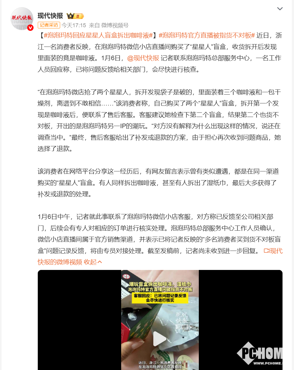 1月6日,据现代快报今日报道,针对近期消费者反映在泡泡玛特微信小店直播间购买的“星星人”盲盒拆出咖啡液一事,泡泡玛特总部服务中心工作人员作出回应,确认涉事渠道为官方销售渠道,已将相关问题记录并反馈至对应部门核查,后续将有专员对接处理。