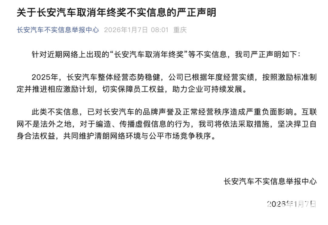 2026年1月7日,长安汽车正式发文回应称,近期引发热议的“取消年终奖”传闻等相关信息为不实消息,公司已根据年度经营实绩制定并推进相应激励计划,切实保障员工权益。