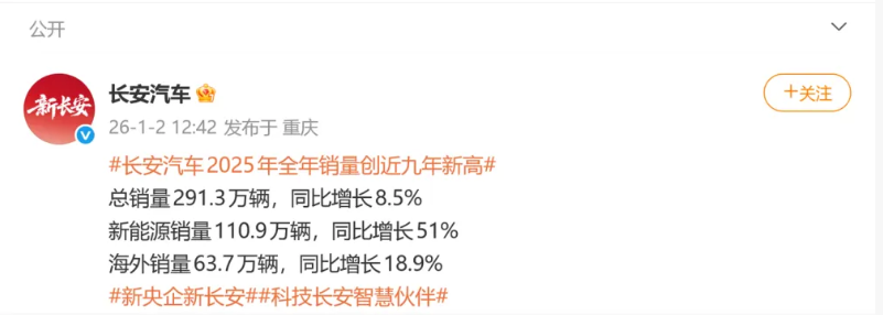长安汽车2025年初定下300万辆销量、3000亿元收入的年度目标,根据官方在1月2日发布的数据显示,最终全年销量291.3万辆、收入约2860亿元,目标完成率达97.1%,其中新能源销量突破110.9万辆,同比增长51%,海外销量63.7万辆,创近九年新高。由此可见公司整体经营态势稳健。