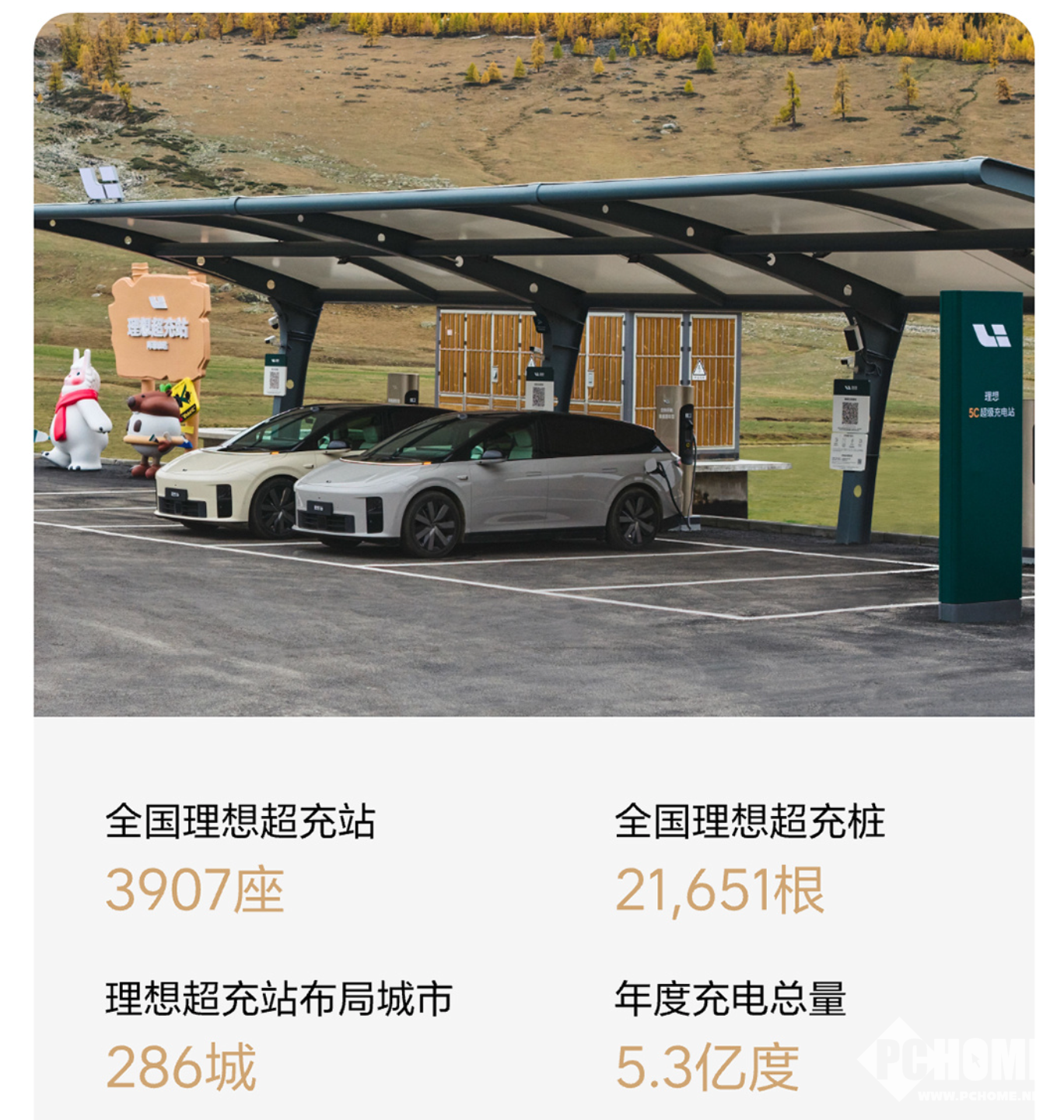 充电方面,全国理想超充站3907座、理想超充站布局城市286城、全国理想超充桩2.17万根,年度充电总量5.3亿度。理想超充站为全部用户提供充电服务1953万次;理想超充站为理想汽车用户提供充电服务871万次;理想超充站为其他品牌用户提供充电服务1082万次;理想纯电用户在5C桩平均充电时长10.9分钟。