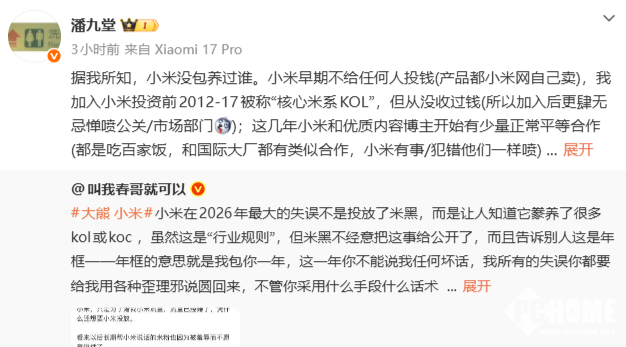 潘九堂表示,他在加入小米投资前,2012年至2017年被称为“核心米系KOL”,但从来没有收过钱。所以在加入小米后肆无忌惮地批评公关及市场部门。由于互联网的发展,近几年小米开始和优质内容博主开始进行少量正常平等合作,和国际大厂同样进行合作,出错时照样进行批评。他认为小米此次与相关KOL接触,估计是被黑昏头了才出此昏招。