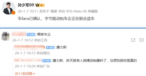 2026年1月7日,车fans创始人孙少军爆料称,字节跳动确认正与某车企联合造车。字节跳动相关负责人回应其传言不实,公司并无直接造车计划。