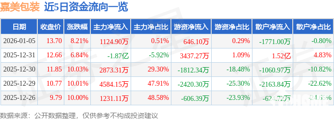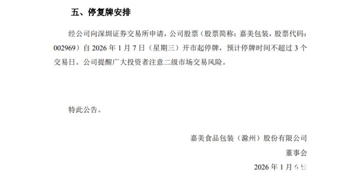 2026年1月6日晚间,嘉美包装发布公告称,因公司股票短期内价格涨幅较大且已背离基本面,为维护投资者利益,公司股票将于1月7日开市起停牌核查,预计停牌时间不超过3个交易日。