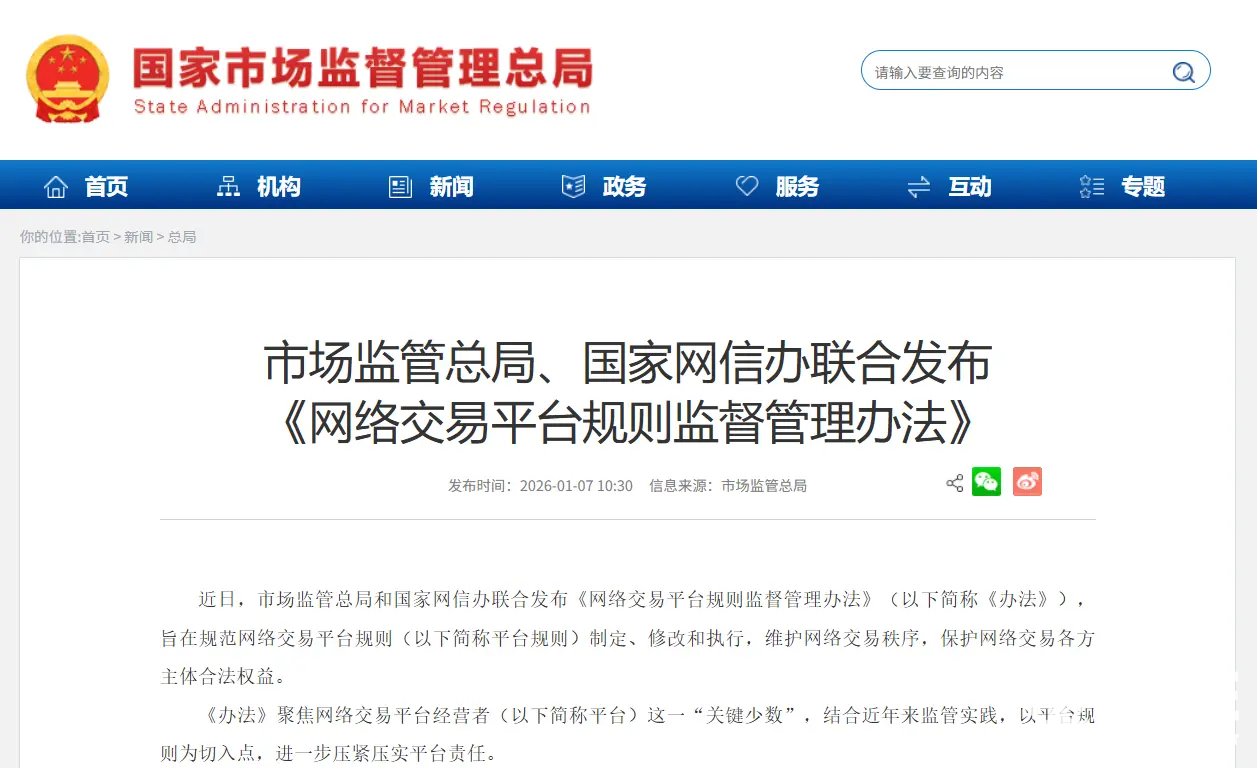 2026年1月7日,国家市场监督管理总局与国家互联网信息办公室联合发布《网络交易平台规则监督管理办法》,明确禁止平台利用规则实施大数据“杀熟”等侵害消费者权益的行为,将于2月1日正式生效。