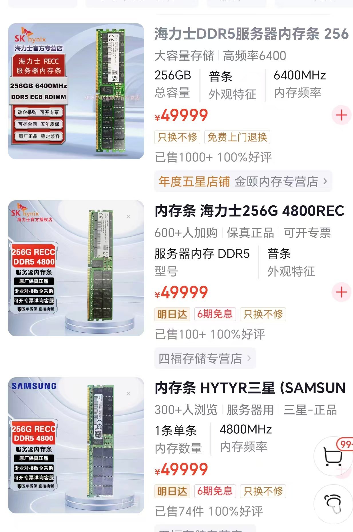 从第三方购物平台获悉,三星、SK海力士等品牌的256GB DDR5服务器内存单条报价已超4万元,部分型号甚至逼近5万元,若按每盒100根的标准包装计算,总价可达400万至500万元,被业内人士形容,其“价值已经超过上海不少房产。”