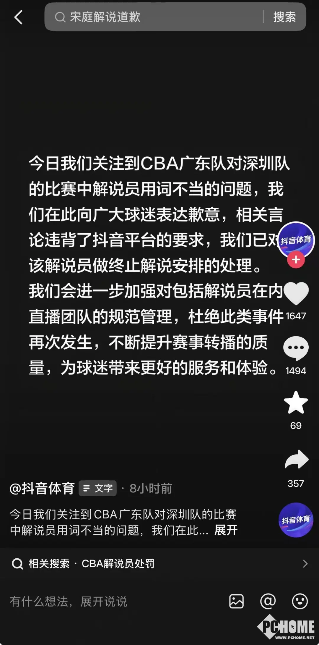 抖音体育在声明中表示,相关言论违背了平台要求,后续将进一步加强对包括解说员在内的直播团队规范管理,杜绝此类事件再次发生,持续提升赛事转播质量。
