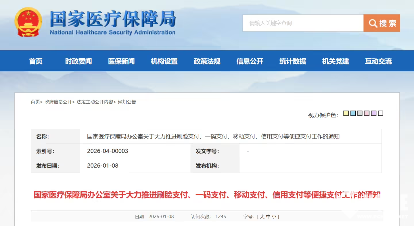 2026年1月8日,国家医疗保障局正式发布了《关于大力推进刷脸支付、一码支付、移动支付、信用支付等便捷支付工作的通知》。