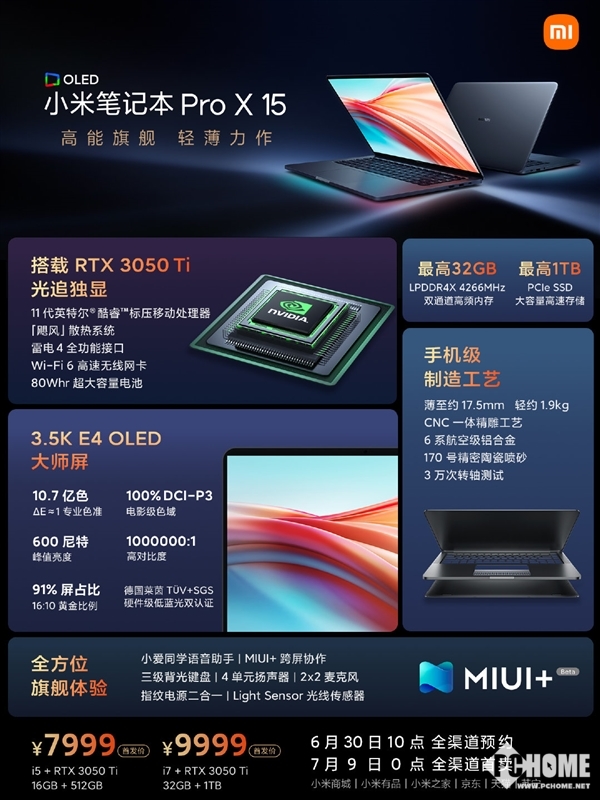 这次小米笔记本 Pro X 15提供了两种配置选择,一款是英特尔酷睿i5-11300H+英伟达GeForce RTX 3050 Ti(4GB GDDR6)+16GB双通道内存+512GB存储,另一款是英特尔酷睿i7-11370H+英伟达GeForce RTX 3050 Ti(4GB GDDR6)+32GB双通道内存+1TB存储,首发价分别为7999元和9999元。