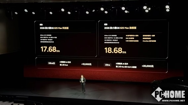 1月8日,2026款小鹏G6纯电车型在小鹏全球新品发布会上正式上市,新车推出625 Max科技版与625 Max旗舰版两款配置,官方指导价区间为17.68万元-18.68万元,额外加1.2万元可选Ultra SE智能升级包,配备2颗图灵AI芯片与第二代VLA,加2万元可选Ultra智能升级包,升级为3颗图灵AI芯片,同时搭载第二代VLA和VLM大模型。