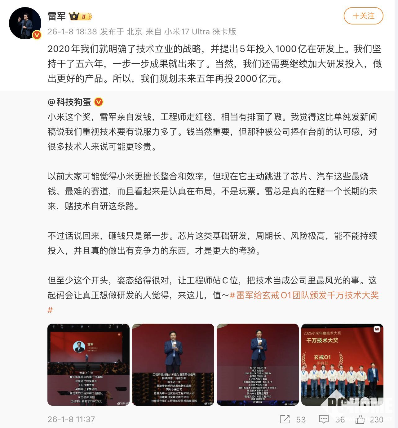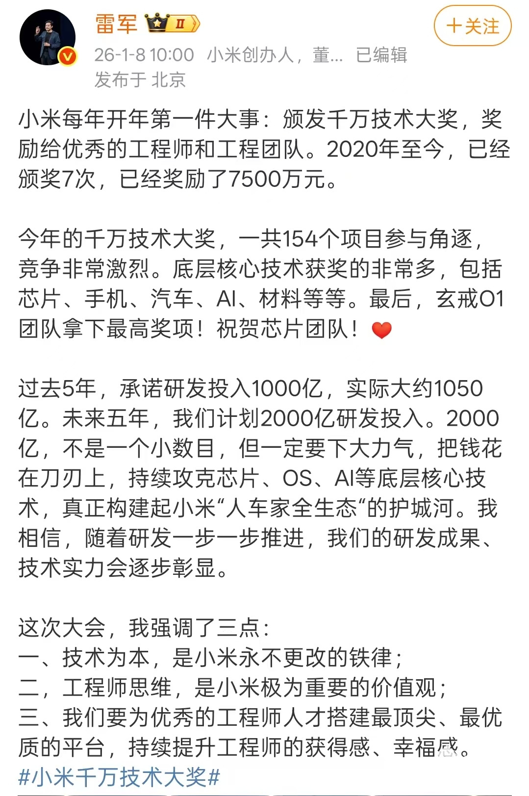 2026年1月8日,小米集团创始人、董事长兼CEO雷军发文称,公司规划未来五年(2026-2030年)新增研发投入2000亿元人民币。