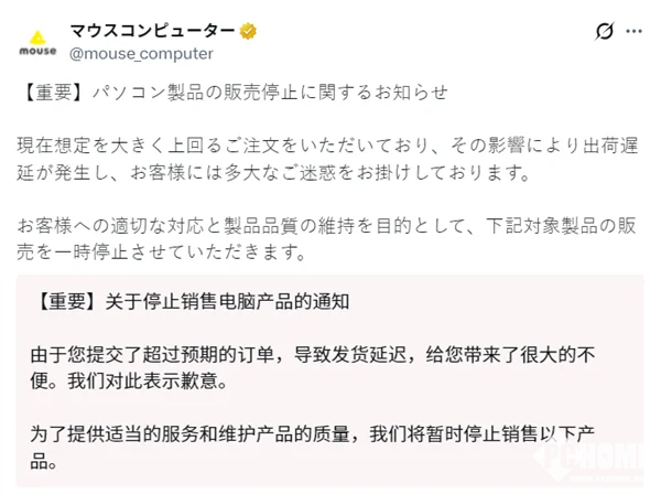 这一现象并非个例,早在2025年11月,日本多家商店就已开始对内存、固态硬盘、机械硬盘全面实施限购,部分店铺规定每位消费者最多购买2块存储设备或4条内存,仅限购买整机或NAS时可协商,以此应对供应短缺的困境。多家PC商店,如Mouse Computer、Sycom等知名品牌也被迫宣布暂停接单,其中TSUKUMO旗下两大整机品牌直接表示2025年余下的日子里不再接受订单。