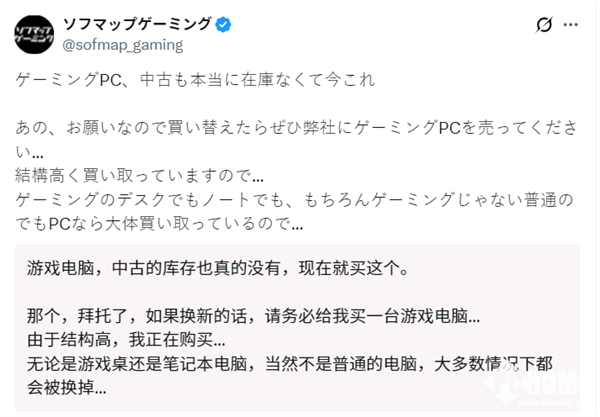 2026年1月9日近日,日本东京秋叶原知名零售商Sofmap Gaming在社交平台上发布了一条近乎“求救”的贴文,恳请顾客将手中的旧电脑卖给商店。