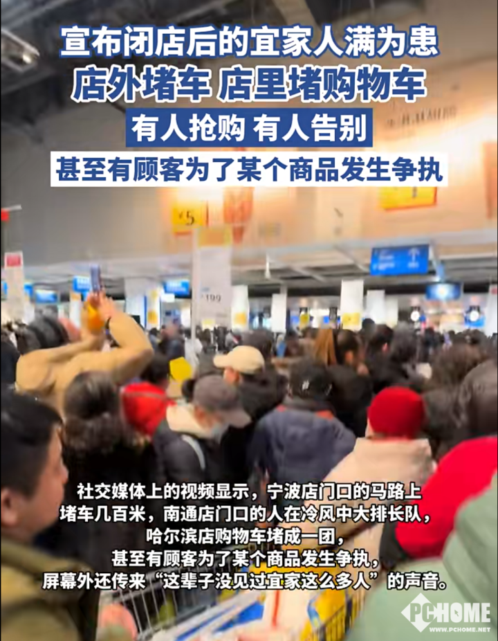 此次闭店引发的客流爆发超出预期。视频中显示,宁波店门口的马路上堵车几百米,南通店门口的人在冷风中大排长队,哈尔滨店购物车堵成一团,甚至有顾客为了某个商品发生争执,屏幕外还传来“这辈子没见过宜家这么多人”的声音。