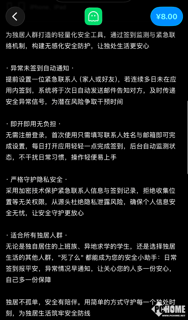 这一成绩源于开发者对当前社会的生存现状及需求的精准匹配。根据《新独居时代报告》发布的数据分析,20-50岁中青年阶段的独居者达到1.1亿人;到2030年,我国独居人口数量预计将达到1.5亿至2亿人,表明独居人群的安全顾虑长期存在。很多独居网友对这款APP的评价是“8块钱买个安心”。