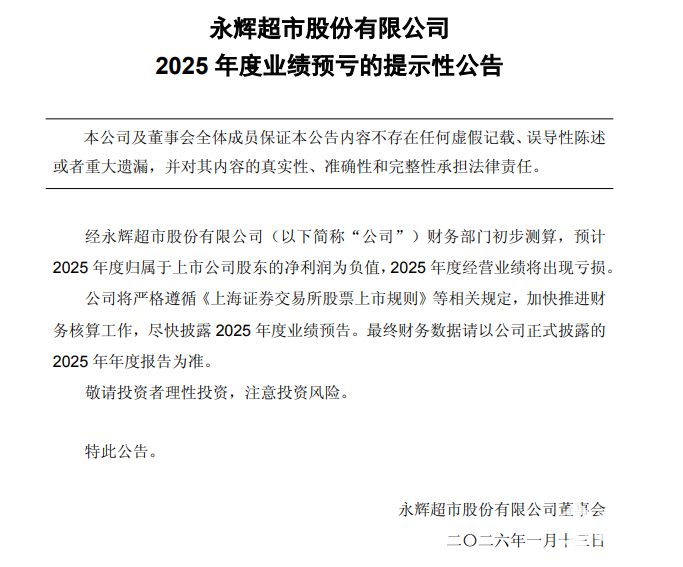 2026年1月12日,永辉超市发布《2025年度业绩预亏的提示性公告》,经财务部门初步测算,预计2025年度归属于上市公司股东的净利润为负值,2025年度经营业绩将出现亏损。