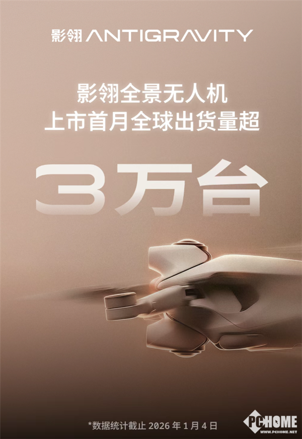2026年1月13日,影翎官方宣布,影石创新旗下全球首款全景无人机影翎Antigravity A1上市仅1个月,全球出货量已突破3万台。