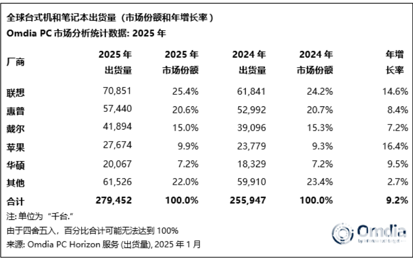1月13日消息,市场调研机构Omdia今日发布2025年全球PC出货量数据。数据显示,2025年全球台式机、笔记本电脑总出货量达2.795亿台,较2024年增长9.2%。其中,2025年第四季度总出货量近7500万台,同比增长10.1%。联想年出货量和季度出货量均位列第一。