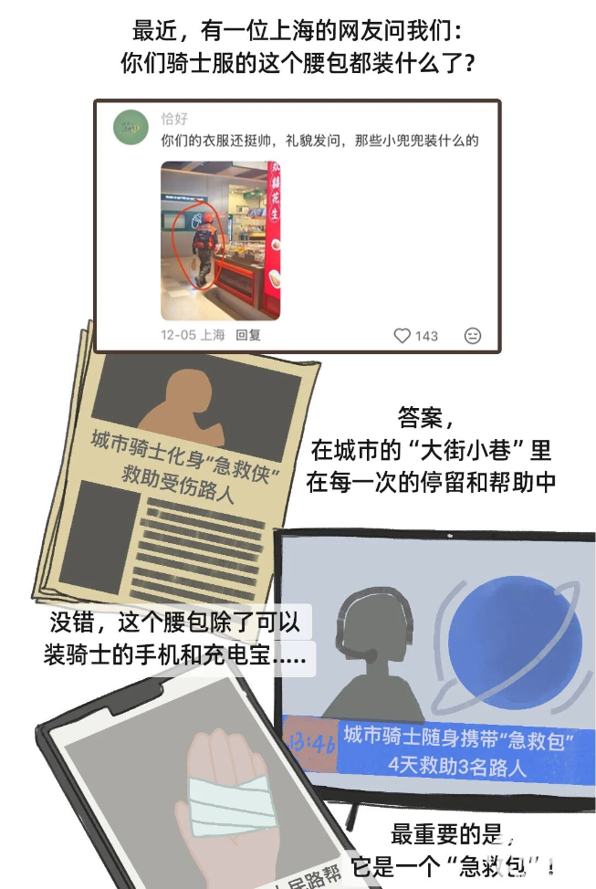据了解,外卖骑手佩戴的腰包除了可以装手机与充电宝以外,还是一个急救包,里面有止血绷带、消毒棉棒、酒精棉片等医用物资,保障了外卖骑手的日常出行应急需求的同时,也能在配送途中帮助到有需要的人。此类情况已经发生多例,如25年9月,杭州骑士蔡光轼在短短4天内用急救包救助了3位受伤路人;25年11月6日傍晚,赣州的城市骑士杜海涛用止血绷带给一起严重交通事故的三个伤者止血等等。
