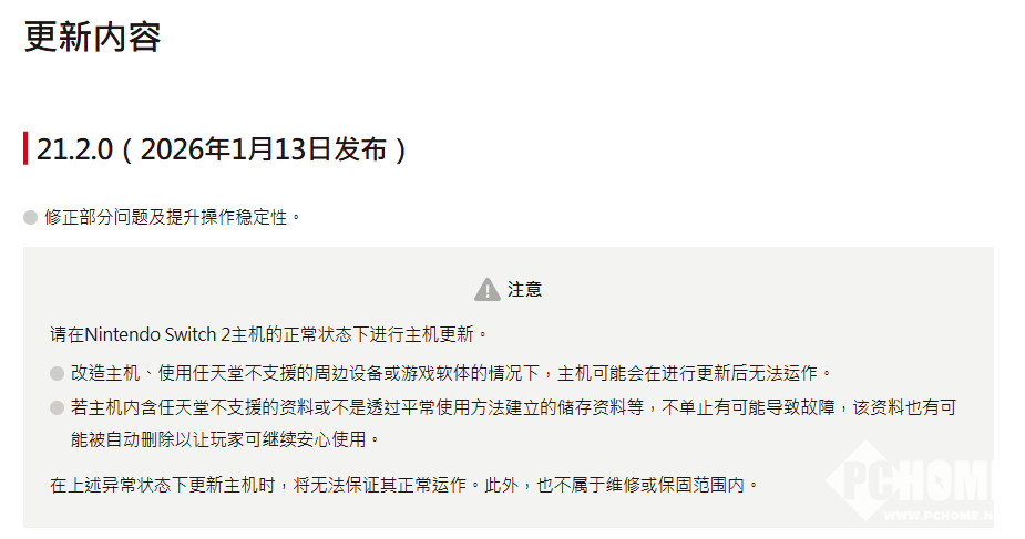 2026年1月13日,任天堂正式推送了2026年首个Switch与Switch 2主机系统更新,版本号为21.2.0。根据任天堂官方发布的更新日志显示,本次更新属于常规维护性质的系统补丁,目标是修复部分系统Bug并提升系统稳定性。