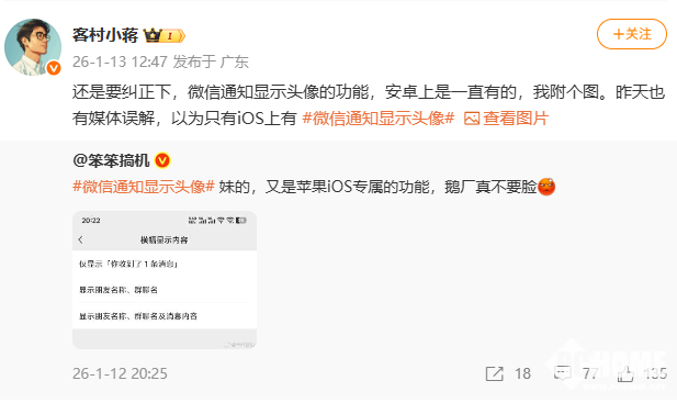 2026年1月13日,对于“微信通知显示头像功能是iOS专属”这一说法,微信内部员工公开澄清,该功能在安卓版本上一直存在,并非iOS独有权限。