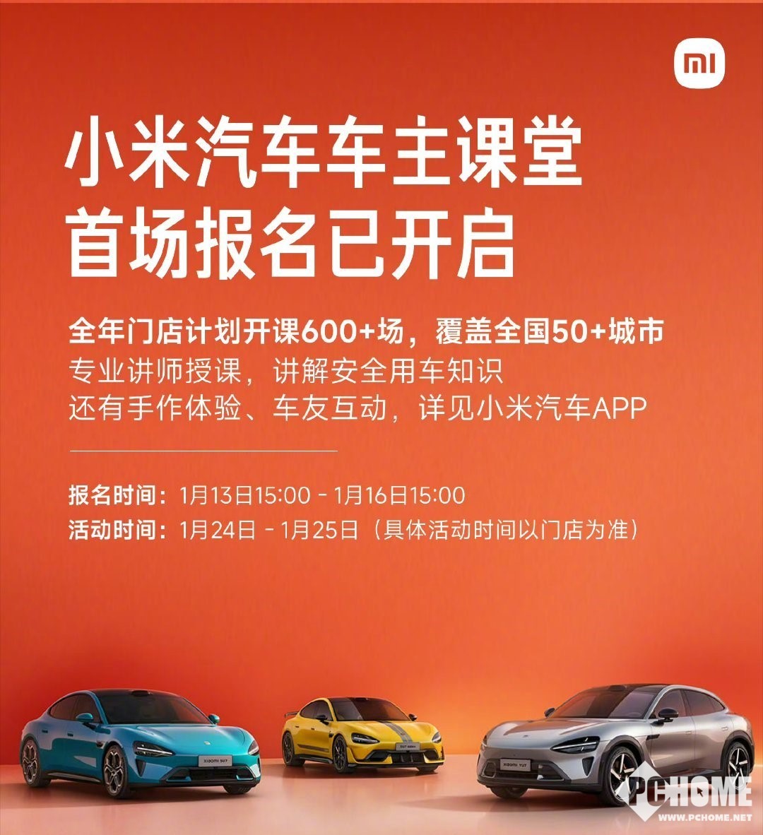 1月14日消息,小米创办人雷军今日微博发文宣布,小米汽车车主课堂已开启报名,今年计划开课600多场,覆盖全国50多个城市,全程免费。报名时间为1月13日15:00——1月16日15:00;活动时间为1月24-25日(具体时间以门店为准)。